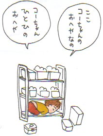 兄くんがおもちゃの棚の一番下の段に入ってるので